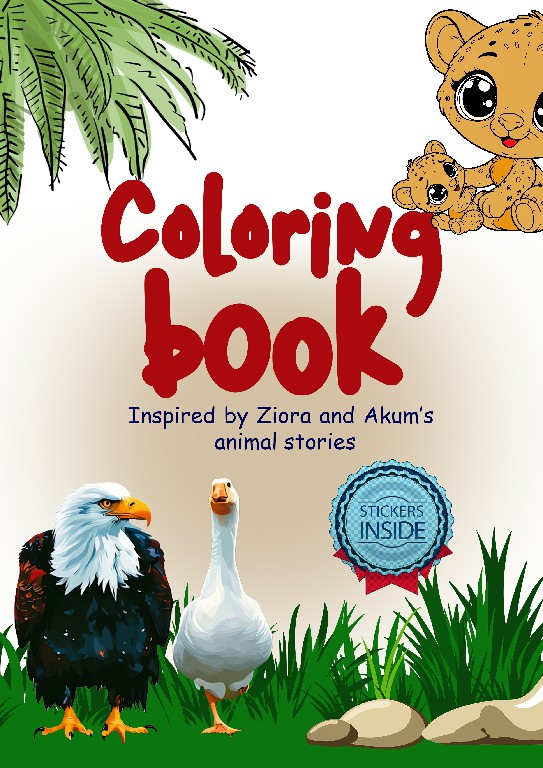 This animal stories coloring book is inspired by Ziora Adighibe’s “The Proud Eagle and the Patient Goose” and Akum Adighibe’s “The Missing Cub.” It has stickers inside.